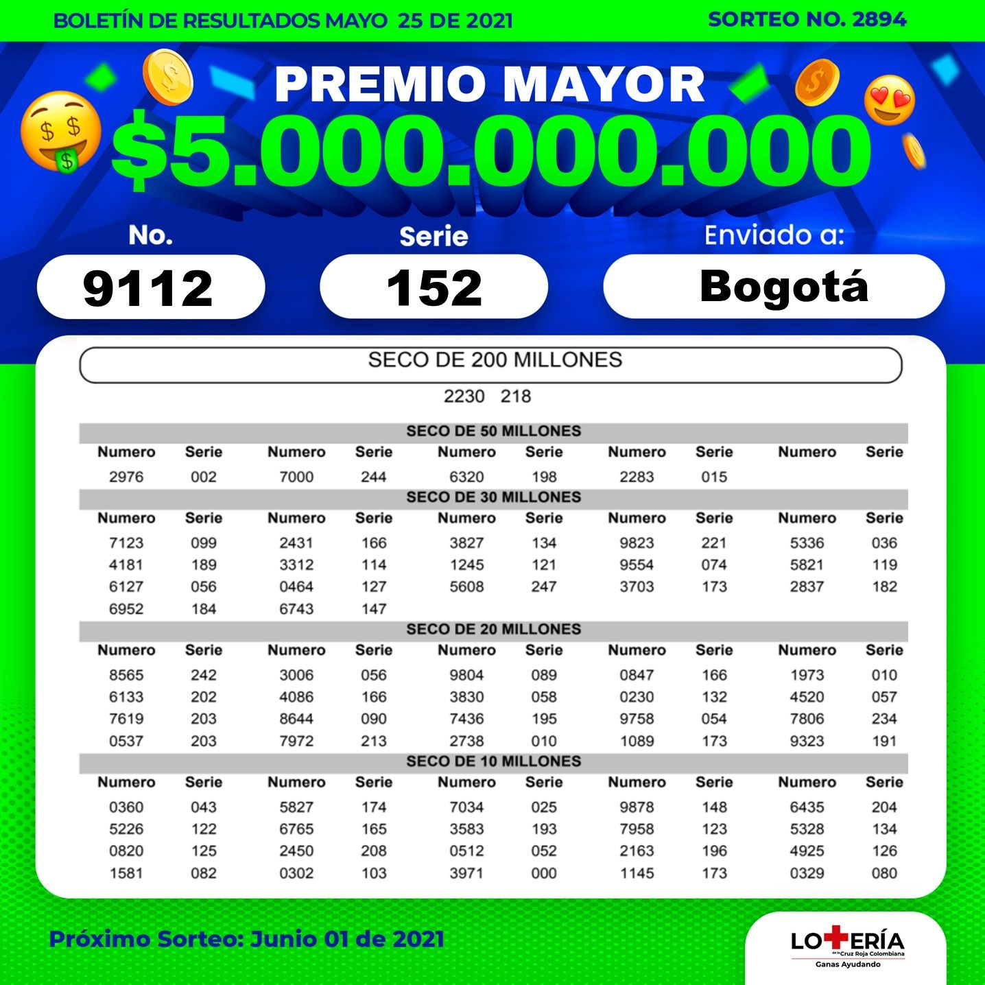 Resultado lotería cruz roja martes 29 de junio 2021 premio mayor de $2.000 millones.